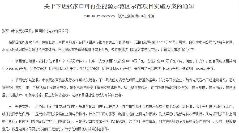 10月12日,河北張家口發布關于下達張家口可再生能源示范區示范項目實施方案的通知指出,安排示范項目15個(詳見附件),其中:光伏項目補貼計劃165.6萬千瓦、備選計劃195萬千瓦(用于調整、補充),配套風電項目并網計劃105.6萬千瓦、光熱發電項目并網計劃15萬千瓦、生物質發電項目并網計劃0.3萬千瓦、天然氣熱電聯產項目4.8萬千瓦、儲能項目19.65萬千瓦。